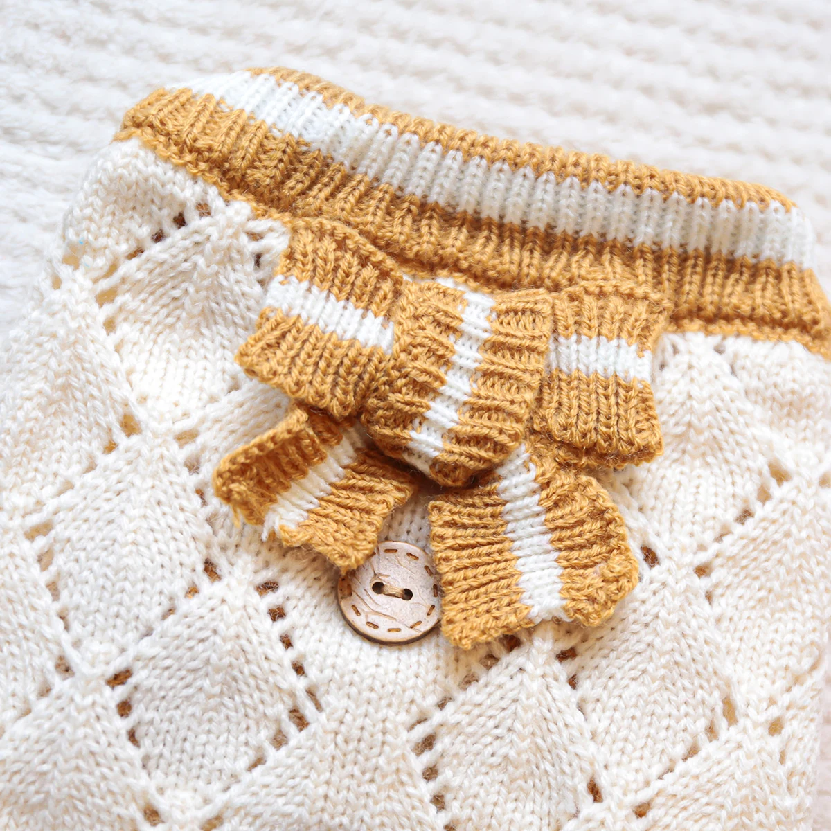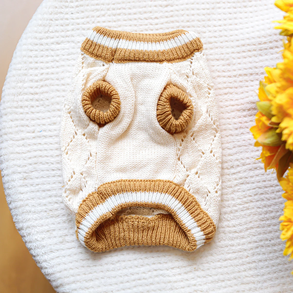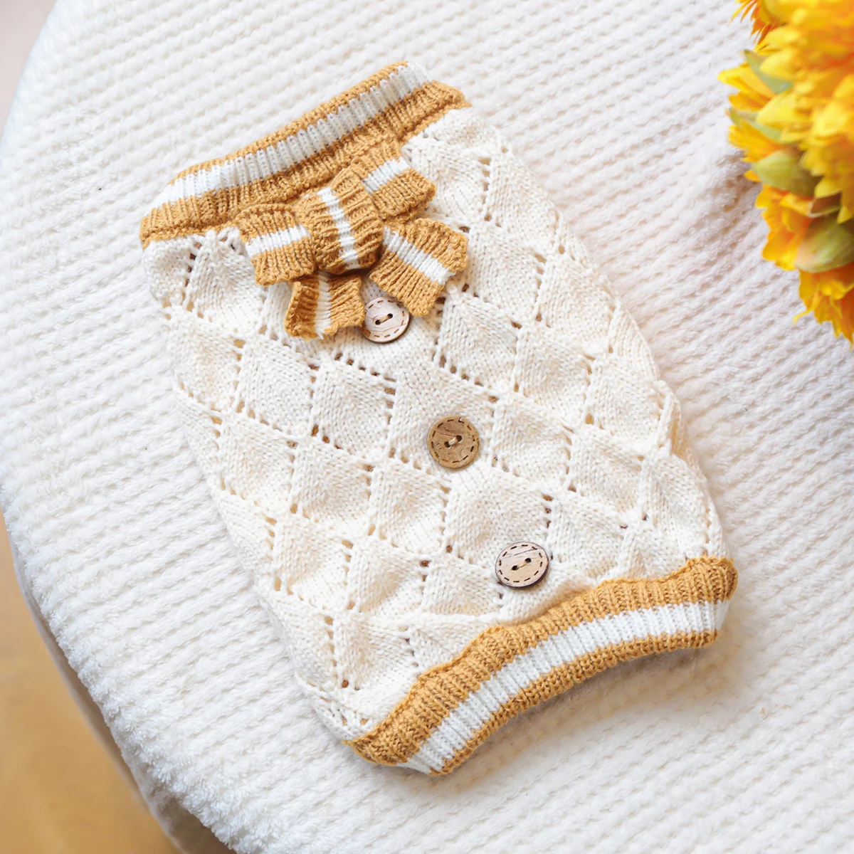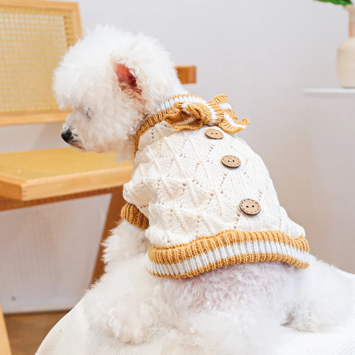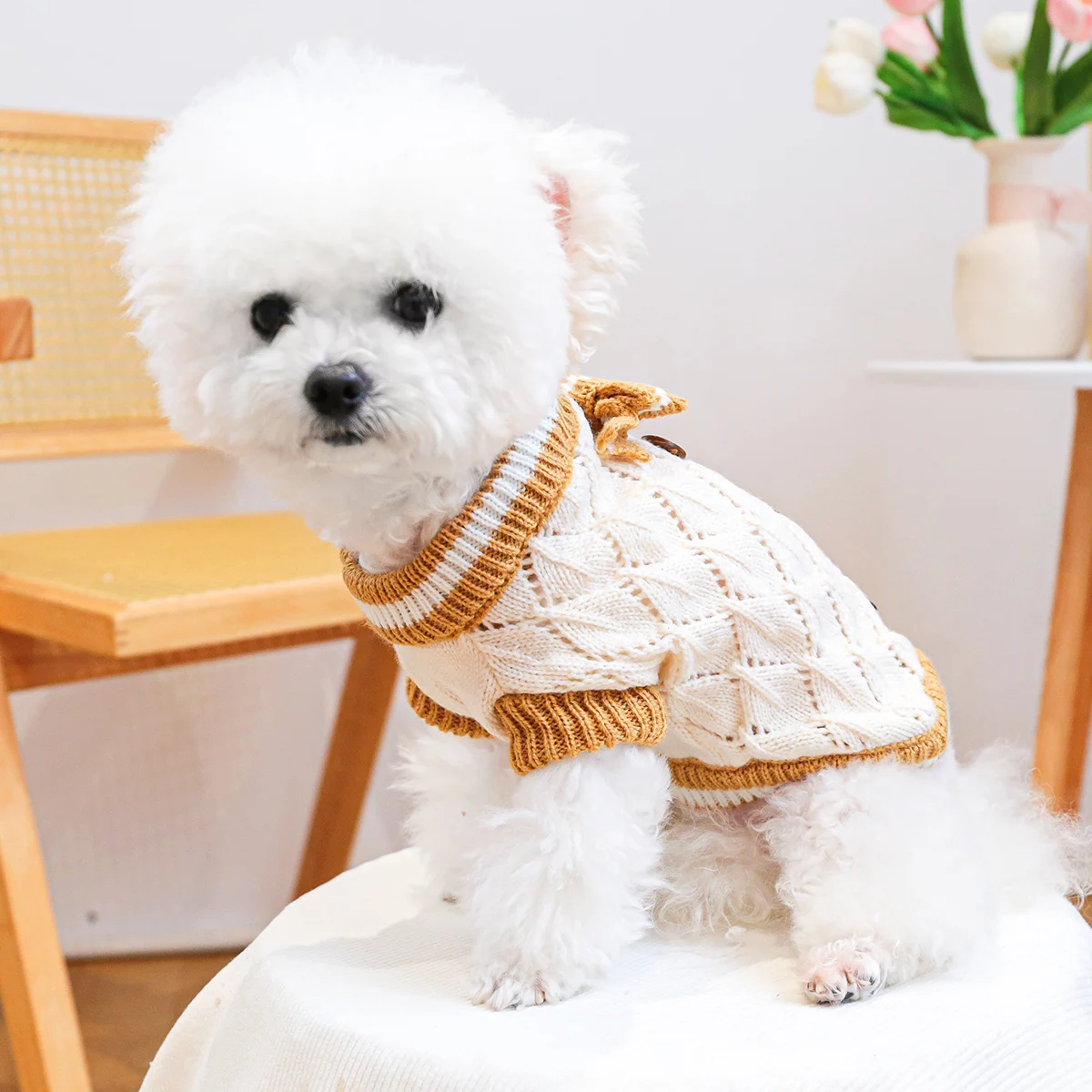 Keep your pup warm and stylish with this adorable knitted dog jumper. Made from soft, breathable yarn, this jumper features a delicate diamond knit pattern in classic cream with contrasting golden-brown trims. The charming striped bow adds a touch of elegance, while the decorative wooden-style buttons give it a cozy, vintage feel.